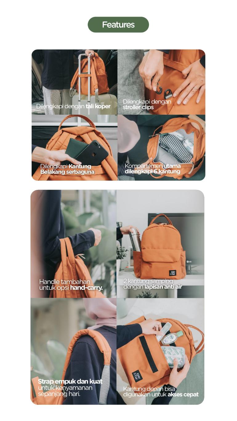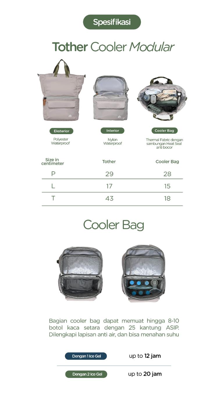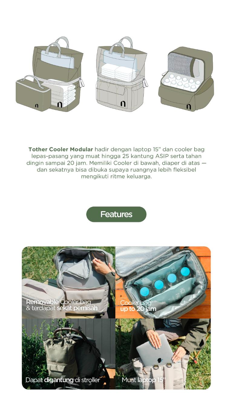 Tother Cooler Modular memiliki kompartemen laptop 15”, cooler bag modular yang dapat dikeluarkan dan digunakan terpisah untuk menampung 8-10 botol kaca atau 25 kantung ASIP dan memiliki ketahanan dingin hingga 20 jam.